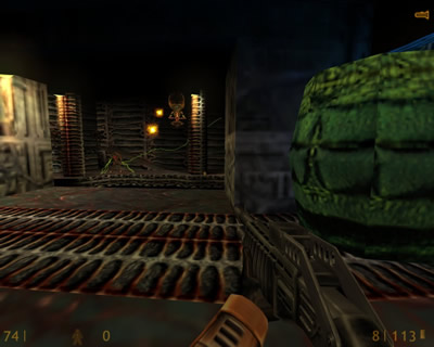 The cover is more important than it initially seems, because a classic monster closet situation is in order once the player hits the switch on the machine. After hitting the switch which activates the tank/generator setup for this wing of Lambda Core, two more Vortigaunts will teleport in. One of them appears virtually on top of Freeman�there's no solving that except by shooting it as quickly as possible. This is classic Doom/Quake-style design.