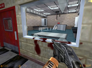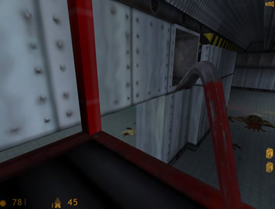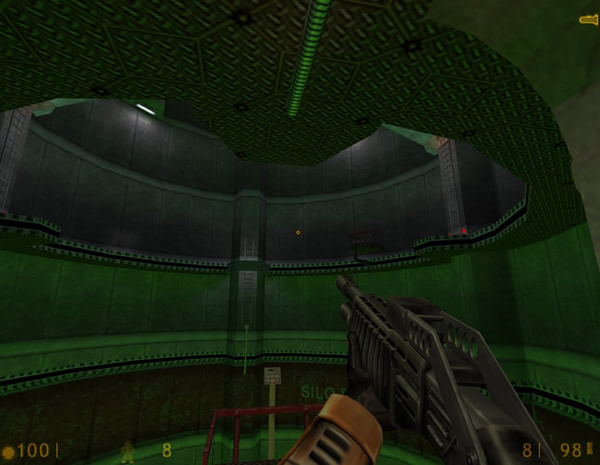 This is one of the best instances of the convergence of fiction and level design for which Half-Life is so famous. Everything in this room would be totally appropriate for an office, and yet it also all works as good platformer content as well. The platform/counter is narrow but not too narrow; its shape offers clear directions on where to go, and the penalty for falling off is not too high. Everything is laid out perfectly without overdoing it, which is exactly how many of Half-Life�s best moments are done.