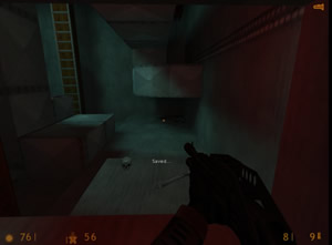 The second set of trip mines is totally in line with what the game has already introduced, but the laser just below the ladder is lethal and new. It probably wasn�t meant to be especially deadly, but the turrets can easily deplete Freeman�s health or even blow up the adjacent mines. There are plenty of instances of a new task being introduced above a damage hazard. Here, the player has to execute a new action or die. This isn�t a hard jump, but still, designers normally train players on the methods of a new jump without killing them at first. The thing that makes this forgivable is that this trip-laser is obvious. Because it's clearly visible as the player descends the ladder, the player has time to save his or her game before attempting it. While Half-Life's checkpoint system isn't uniformly robust by modern standards, an obvious warning of lethality like this one accomplishes the same effect as a nearby checkpoint would.