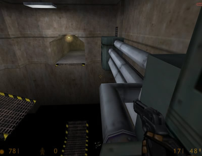 These enemies can easily surprise the player, but none are instantly fatal because they come one at a time. Although plenty of games had mixed platforming and shooting before 1998, Half-Life does it in its own unique way. Each of those sniping enemies is tucked away in places that the player won�t notice at first, but which are easy to see once the fight starts. As you might recall from the introduction, this tendency to hide enemies in slightly unexpected places is an important development in the history of the FPS, and it's something the player has seen a lot of so far in the game. It's a totally logical step for the designers to combine the hidden-enemy corner with platforming in an A+B evolution, and the designers do so.