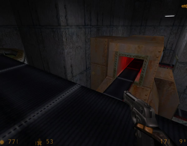 I repeat myself when I say that surprising the player with instant death like this is not a great idea. Half-Life and its checkpoint system would have seemed very forgiving for its time, but there�s just no reason to hide these mines in the dark the way the designers do. The thrill of this challenge isn�t in knowing that the mines are there, it�s in blowing them up from afar by jumping backwards against the movement of the conveyor belt. If the player can simply see the mines coming and then blow them up before the conveyor belt drags Freeman to his death, that thrill is still in play. The surprise death is superfluous.