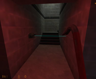 This set piece gives us one of Half-Life's better platforming puzzles, one that puts more emphasis on problem solving than on hand-eye coordination. Because this room takes many attempts to pass, and because the solution to the puzzle is unconventional in the context of Half-Life, I've included it in the platforming theme rather than as through content. This content is clearly a part of the series of laser/platform puzzles, rather than a piece of pacing content. The room is loaded with a massive amount of explosives, so that any failure results in certain death. The laser beams for the explosives are placed so that ordinary jumps can't surmount them, and the highest beam is also too close to the stairs for a crouch-walk to work, either.