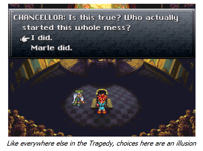 For toying with player expectations, the trial scene is even worse. The trial attempts to convince the player that he has far more choice and agency in the world than he actually does. First time players will almost certainly commit a number of errors at the Millennial Fair which the Chancellor will use against them. There’s the obvious, bright pink lunch that seems like an easy snack. There’s the option to convince Marle to sell her pendant. For that matter, there’s the pendant itself. It’s a very easy mistake for a new player to make, grabbing the pendant first before talking to her. But the one almost every player makes is pulling Marle away from the candy store. How are you supposed to know that even one small move would be used in a trial, later?