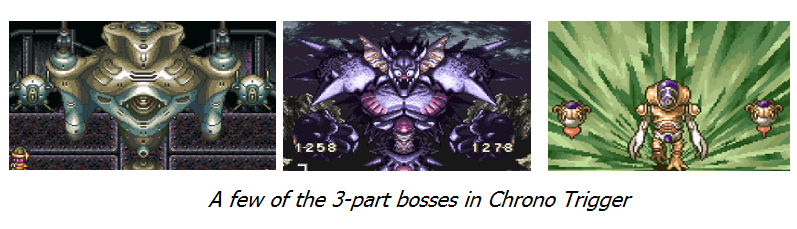 Finally, we have Yakra, a boss that defines one of the major types in Chrono Trigger: attrition/spike. Attrition/spike bosses in Chrono Trigger generally work like so: the boss spends 2-3 rounds dealing small amounts of damage to every party member, before launching a high-damage, single-target attack. There are variations on this theme as well that we’ll see in other bosses, but the attrition/spike design is used often. Although this design repeats, Chrono Trigger’s designers did a good job of making sure it would provoke a different response each time. In the case of Yakra the player will probably resort to a dual-tech-and-heal strategy (X-Strike plus items), but this won’t be the case in every boss fight--not even others like this one.