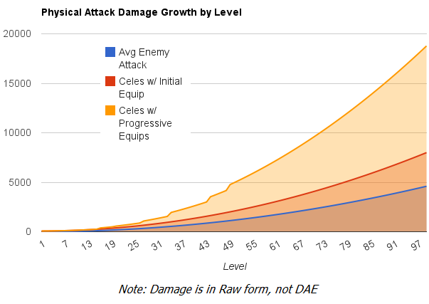 What the designers did was to emphasize two things instead of stats: one of them was equipment, and the other was character levels. Below is a graph charting the relative importance of levels and equipment in modifying physical attack damage.