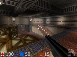 Gameplay is good, but with only 53 monsters, the map is not a huge, long map. However, enemy placement is good, and the enemy mix is also well chosen to increase the challenge. There are lots of the fast, little purple rhinos hiding behind crates to surprise you, and ogros are well placed to corner you with their fast fireball attack. In addition health seemed to be quite sparse, which makes gameplay more exciting and tense, i died quite a few times! A couple of triggers need to be found to open up barred doorways, and then you enter into the little, metallic, underground maze section. One flaw here is that you can trigger all the big monsters (slith, Bauul) that are waiting in the trees/river area whilst still hiding in the tunnels and this makes it much easier to kill them, as they are too tall and can not see you properly in the tunnels!