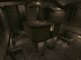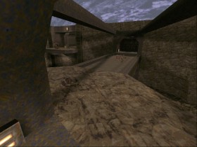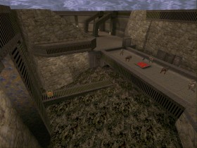 Brushwork is in general good, neat and solid-looking, with lots of metallic walkways and platforms, and a good blend of rockfaces and metalwork, with some interesting beams, girders and detailing. The map layout is nicely interconnected as well, but in someplaces it feels like a series of random areas stuck together rather than a coherent place; there isn't much consistency to the layout. Lighting is good however, and adds to the appeal of the map.