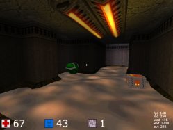 Well, this is a decent cube SP map, the first cube level from this author (but hopefully not the last!). The architecture is very well done in this map with good texture choices. The setting is a typical idbase type environment from Quake 1, but translated into the virtual world of Cube. Detailing is good, there are lots of nice metal beams and girders in the corridors and rooms, and also a nice theme of white fluorescent lighting on these beams and also set into the stairways.
