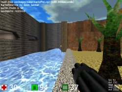 This is another SP map by Pushplay, the same Author that made "Stalingrad 2215" for us. This map is not as long as that map, but it has more detailed architecture and texture work. Its another base map, like "Kartoffelernte" (reviewed above), and again its a decent implementation of the base style. There is some interesting lighting, with the first area quite *dark* and then opening up into brighter bigger rooms after that, and a nice dark red sky as well. There is also some interesting detailing, with rusting pipes in the water section and little details and metal beams set into some of the walls. The only bit of the architecture which was weak in my opinion was the big "ammo room" near the end (literally the architecture consists of ammo boxes and health boxes) it felt too "cartoony" to me, and seemed out of place compared to the rest of the map's theme.