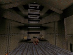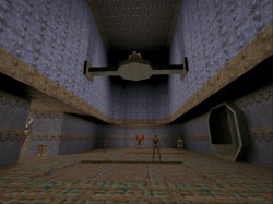 Map build and detailing is generally quite imaginative, without being spectacular; the rooms are generally slightly boxy and similar to each other, and the blue texturing is somewhat uniform, in both architecture and textures therefore, more variety would be better. Also, i got stuck at the top of one of the wind tunnels and had to noclip/fly my way out. Overall, though architecture is solid. There is a pleasing amount of buttons to push, which opens up walls or new rooms, this coupled with the straightforward gameplay reminded me of the old quake maps from earlier years (1996/1997 etc), and in gameplay terms even slightly of Doom.