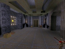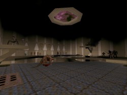 Anyway, its a kind of base level, except there is just one big room (the bottom half filled with water), with a couple of side areas, you need to collect 4 runes placed around the map and also the blue and gold keys before escape is possible. A couple of textures are missing in some places. Its not a very hard level to finish (37 enemies), with lots of ammo etc, maybe this is due to the speedrunning purpose already mentioned.