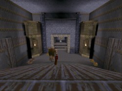 This is a map clearly in the style of id original Quake maps in Episode 2, that is a medieval theme. This translates into decently-built architecture with metal and blue stone textures and lots of medieval monsters; Ogres, knights, hellknights, Shamblers etc.