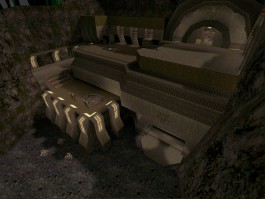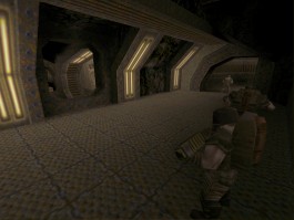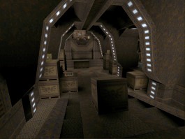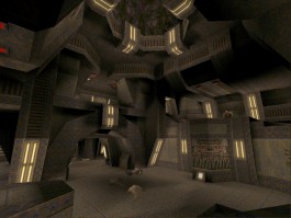 This is a very well built medium/large custom-textured base map. The textures mainly used are Speedy's SpeedBz texture set, and they give the map a green/base/industrial type feel. The architecture is really quite original, the main feature of it is angular archways running throughout the level. This is a good example for other mappers of how to avoid typical boxy square rooms and corridors. The Archways are well built and give the map its own look and feel, rather than being just another base map. Lighting is also nice, the subdued lighting and neat spotlighting contributing significantly to the overall look of the map, which is very pleasing.