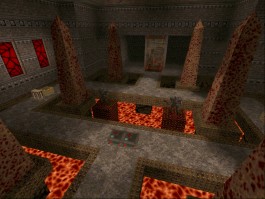 FULL REVIEW: ![]() ![]() The textures look just as good as they always did and Vondur also includes a nice iron-red riveted metallic trim. The grey brick walls are nicely offset by the white/red checkerboard floor texture, the bright reds of lava and colored books and symbols. I also liked very much the little holes in the floor where lava shines through from below. Architecture is good, without being spectacular. The early section of the map consists of a series of corridors, stairways and rooms, with some nice traps and shortcuts being set up. About halfway through, the map opens out into interesting, bigger, more expansive open areas including a couple of cool stairways/walkways over lava. There are no huge open areas, but there are a number of multi-tiered, very well constructed rooms, with lots of neat little details. Lighting is also very good, nicely subdued and shadowy to create a good quake 1 medieval atmosphere. ![]() ![]()