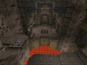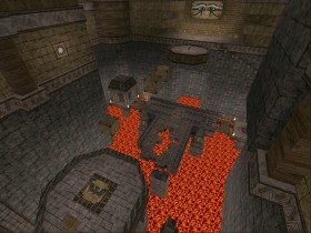 A large stone Egyptian temple, covered primarily with Sock's Egyptian texture set, is a well built and designed layout, with lots of imaginative structures and good detailing in the textures. Brushwork throughout is good, solid, often on a spectacularly grand scale. There is a very good level of diversity in the temple, square boxy rooms and corridors are avoided, instead there are some superb huge open areas, with yawning chasms of lava below, large stone rooms and big stone pillars and walkways. There is a very nicely executed underwater section, and lots of good lifts. The interconnectivity of the map is good as well. Lighting is average [possibly there could have been more variation in lighting with some more dark shadowy areas] and texturing is very good throughout, a consistent theme, yet with enough variation in detail to not get to repetitive.