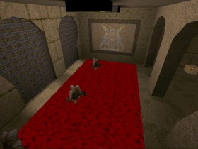 Well balanced gameplay means the weapons/ammo/health balances against a diverse range of well positioned monsters, and that's exactly what happens in this map. There are several nasty attacks and surprises [2 shambler lurking in a dark corridor are particularly unwelcome]. Mixing exploration and fighting well, the player progresses to the final area/waves of monsters spawning attacking climax, which has a possibly too generous supply of ammo and health with it.