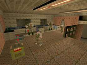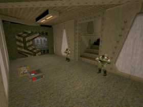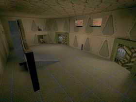 The map layout is a small, decently built and textured (classic id base textures) base. There are some nice features such as the "weapons scanner" and accompanying alarm, and broken doors.