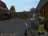 A sniper takes aim at the Hunted. Soldiers can rocket jump at this point and get up onto the rooftops.