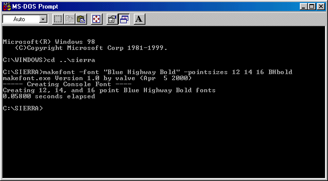 Get the MS-DOS prompt to the directory where you placed makefont.exe, in our case C:\Sierra. Your prompt will probably start at c:\windows>, so you want to type "cd ..\Sierra" and hit enter. If the the DOS prompt now says c:\SIERRA> you're ready to go.