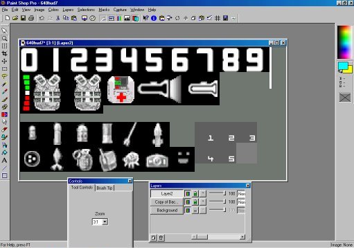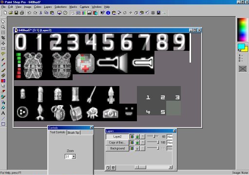 It is much handier here to have an image program with some advanced features. I'm using Paint Shop Proin this example, but use whatever you wish. I find it easiest to make a duplicate layer of the original HUD, then do the work on one of the layers. If you make your new layer slightly transparent, you can see the original below and line things up correctly. Using a duplicate you also won't have to recreate image portions that you don't intend to change. As the image is grayscale, you may have to increase the number of colors available in order to create layers. You will certainly have to add red and green shades to the image's palette if you intend to use them. The final image can be a 256-color, single layer bitmap and you can save it as any name you wish. We'll stick with hud.bmp. Here's a look at an edit in progress, with the new layer over the old: