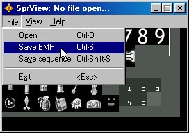 Now you have the sprite, but to start editing you need a bitmap. The handy program SprView can take care of this job. Open up SprView, choose File->Open, browse to Half-Life/valve/sprites, and choose to open 640hud7.spr. You'll be able to see the display numbers 0-9, health cross, little armor man, etc. Now choose File->Save BMP. Save the image as a name you'll remember somewhere where you can access it easily. This can be right in the sprites folder if you choose. For our example, we'll call it hud.bmp.