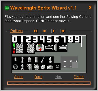 Now it's time to turn your wonderful bitmap creation into a sprite the game can use. How is this done? Well, fortunately Michael "Spider" Morace of Wavelength was kind enough to create the Sprite Wizard. Start SprWiz, choose Next, then choose Browse. Browse to hud.bmp and select it. Choose next, choose next, choose Additive (default), choose finish. Save the sprite in Sierra/Half-Life/valve/sprites as 640hud7.spr (save in a mod folder such as tfc/sprites if you want it to be specific to one mod).